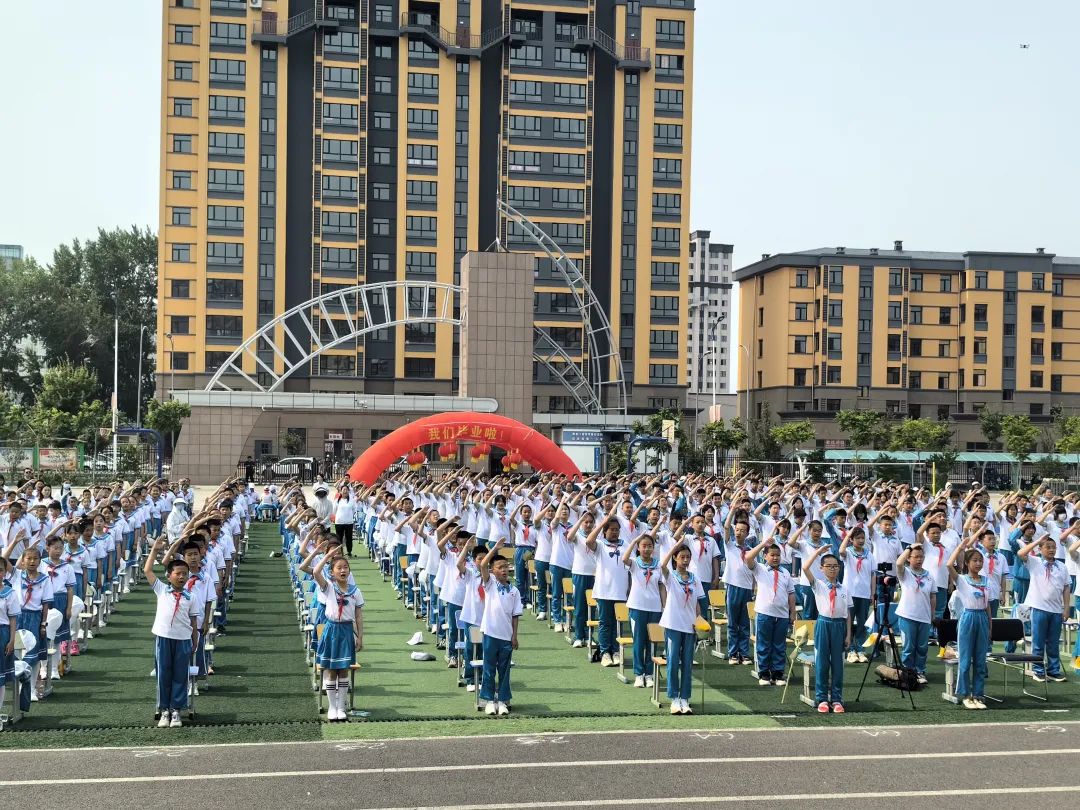 典礼现场,全体毕业生身穿整齐的校服从彩虹门入场,五年级同学向毕业生献上朝气蓬勃的向日葵,祝福他们像向日葵一样朝气蓬勃,向阳而生。毕业演出中,歌曲合唱《我的歌声里》、架子鼓表演《赛马》、诗朗诵《中国少年》、舞蹈《冬日》《丽人行》、古筝独奏《兰亭序》等节目轮番上演,同学们用自己的青春洋溢为毕业典礼刻下了浓墨重彩的一笔。