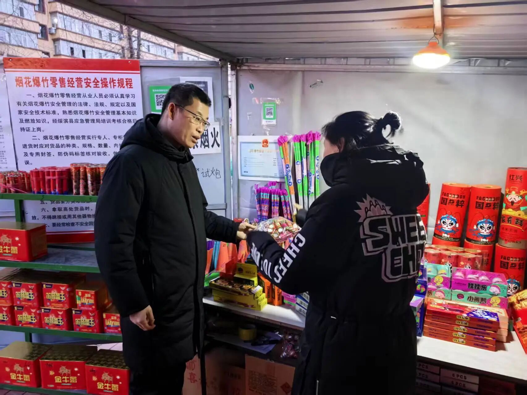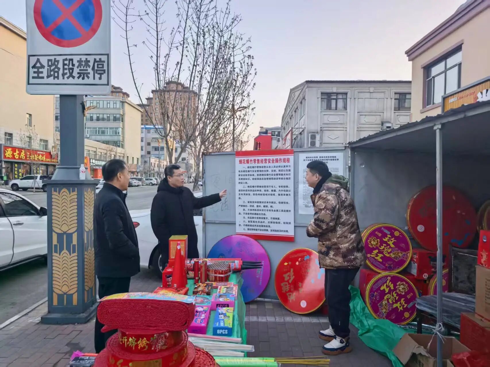 在县域重点路段的短期烟花爆竹零售点,宋吉祥对零售点经营资质、产品质量、储存规范、安全设施等关键环节进行全面细致检查。针对检查中发现的个别零售点警示标识不醒目、消防器材摆放不规范、货物堆放未达安全标准等隐患,检查组现场提出整改意见,指导经营户立即整改到位,坚决将安全隐患消除在萌芽状态。