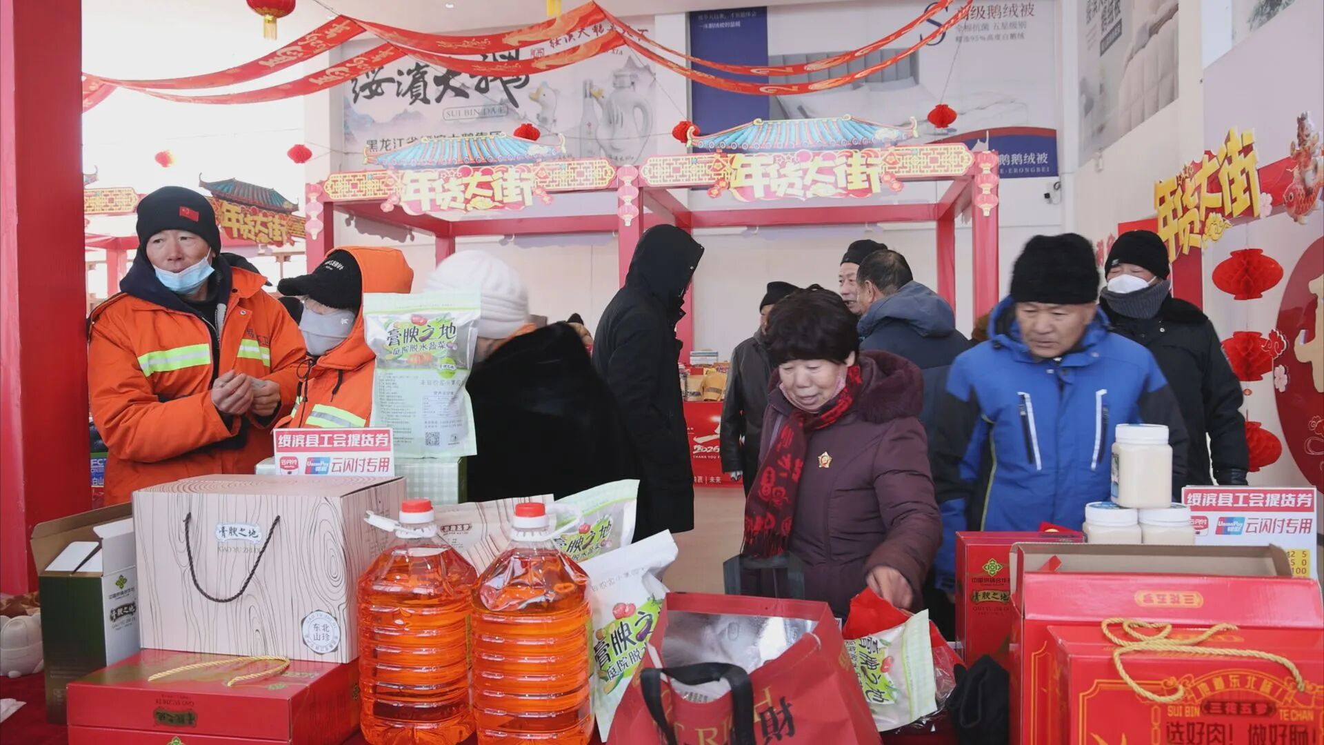 绥滨镇居民丛丹丹:我每年都来大集备年货儿,这儿的东西既便宜又全乎儿,而且有本地的熟食还有土特产啥的。我今天特地多买了几袋儿酸菜,等到过年炖菜和包饺子吃。