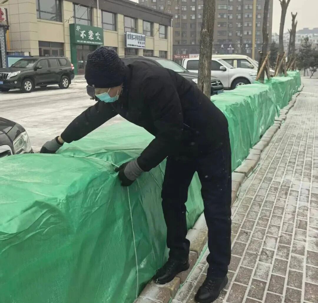 在松滨大街、通达路等路段,工作人员手持保温布、扎带等工具,按照“缠紧、缠匀、不外露”的标准,小心翼翼地为树木缠绕草绳,再用保温布覆盖外层并固定牢固。针对抗寒能力较弱的树木,工作人员还额外增加了防寒层厚度,进一步提升树木抗寒耐旱能力。据了解,此次冬季树木防寒养护工作涉及小叶丁香、美国红枫等多个树种。通过科学包裹为树木筑牢“保暖屏障”,既有效节约明年补植栽种成本,更能显著提升树木来年成活率。截至目前,已完成城区内5400平树木的防寒包裹工作。