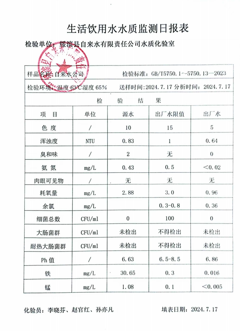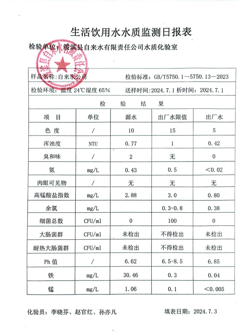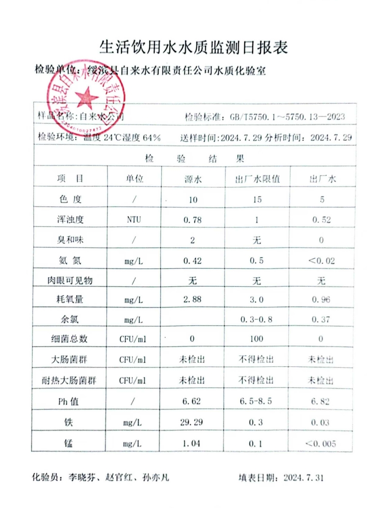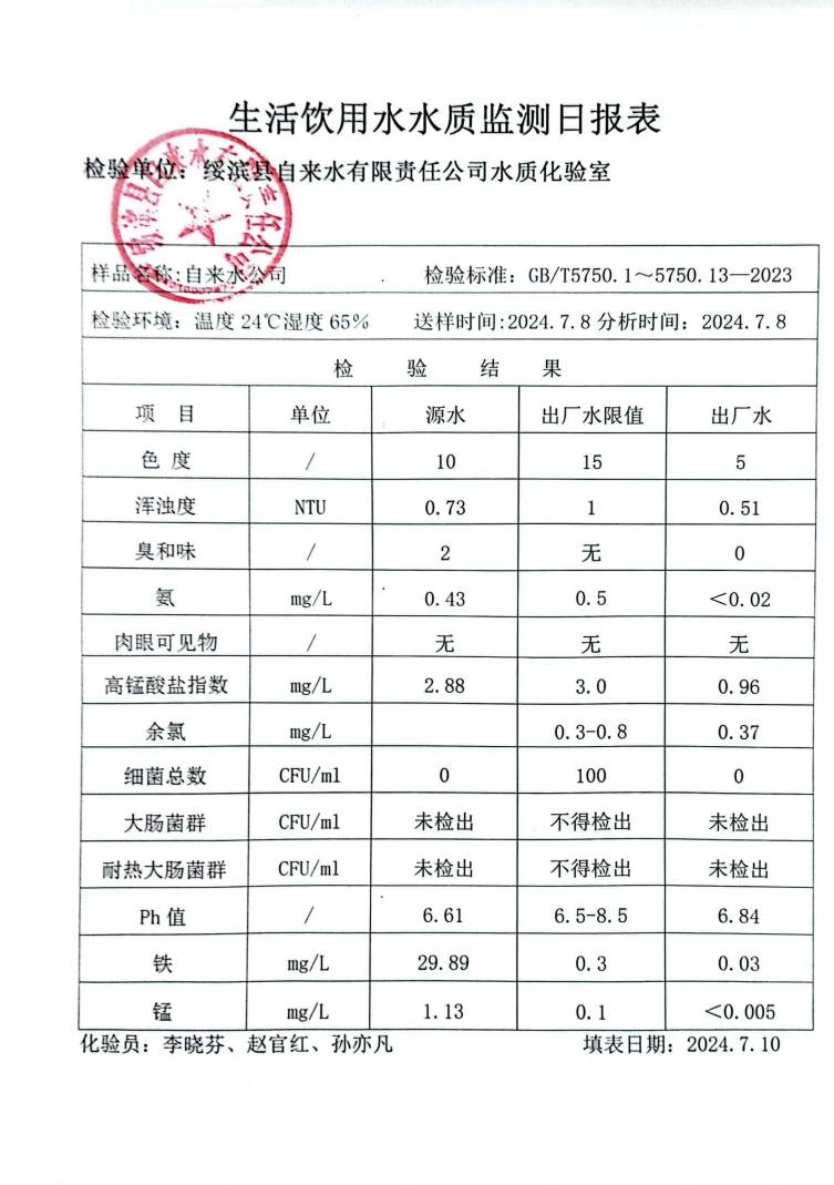 2024年7月份绥滨县自来水公司出厂水水质检查报告