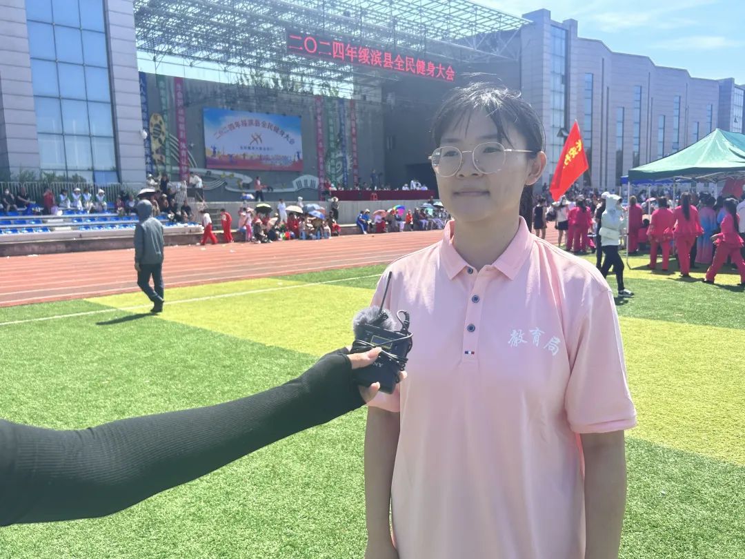 县教育局代表队运动员王莹:我们组获得了4×100米接力比赛第一名。在接力的过程中,大家配合默契,感谢队友的付出,我的心情非常激动,在此预祝全民健身大会圆满成功。