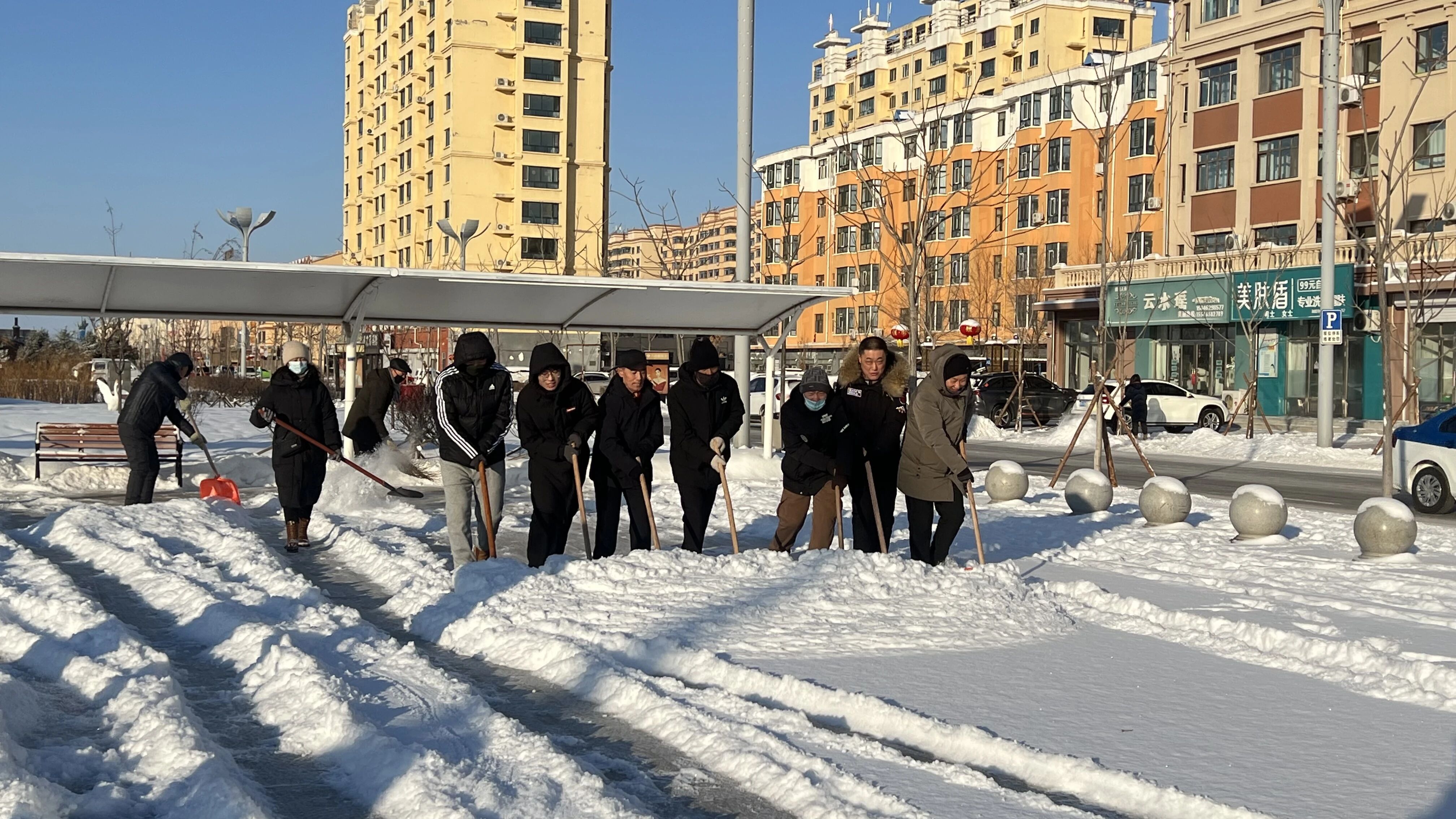 12月20日,绥滨镇兴民社区组织社区志愿者,到县沿江公园广场开展志愿清雪行动。