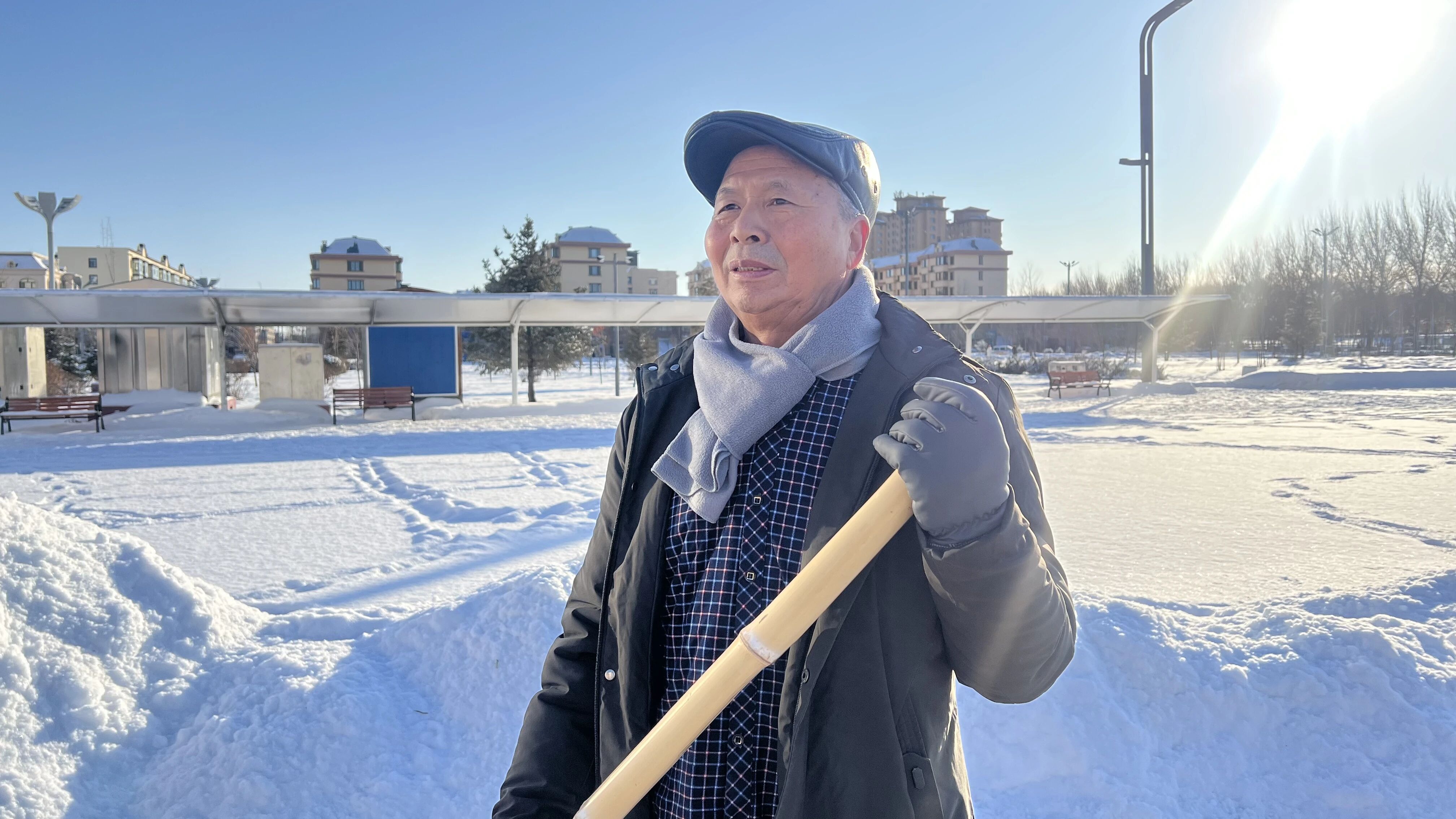 绥滨镇居民吕玉忠:我是兴民社区的居民,看到环卫工人清雪十分辛苦,就抽出业余时间帮忙,尤其是广场,我们老年人常在这里活动。把广场积雪清干净,我们开展活动也更方便。