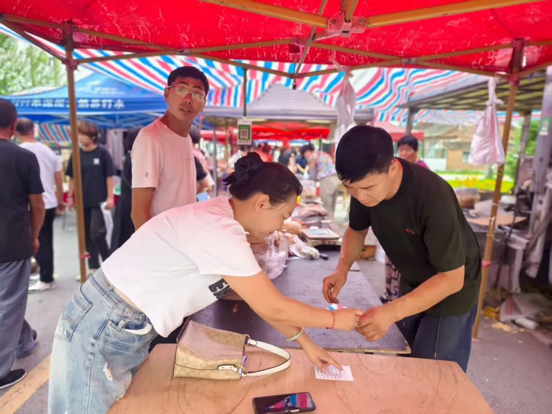 近日,二九〇社区管委会工作人员走进热闹的大集,开展摊位登记卡的办理与发放工作。