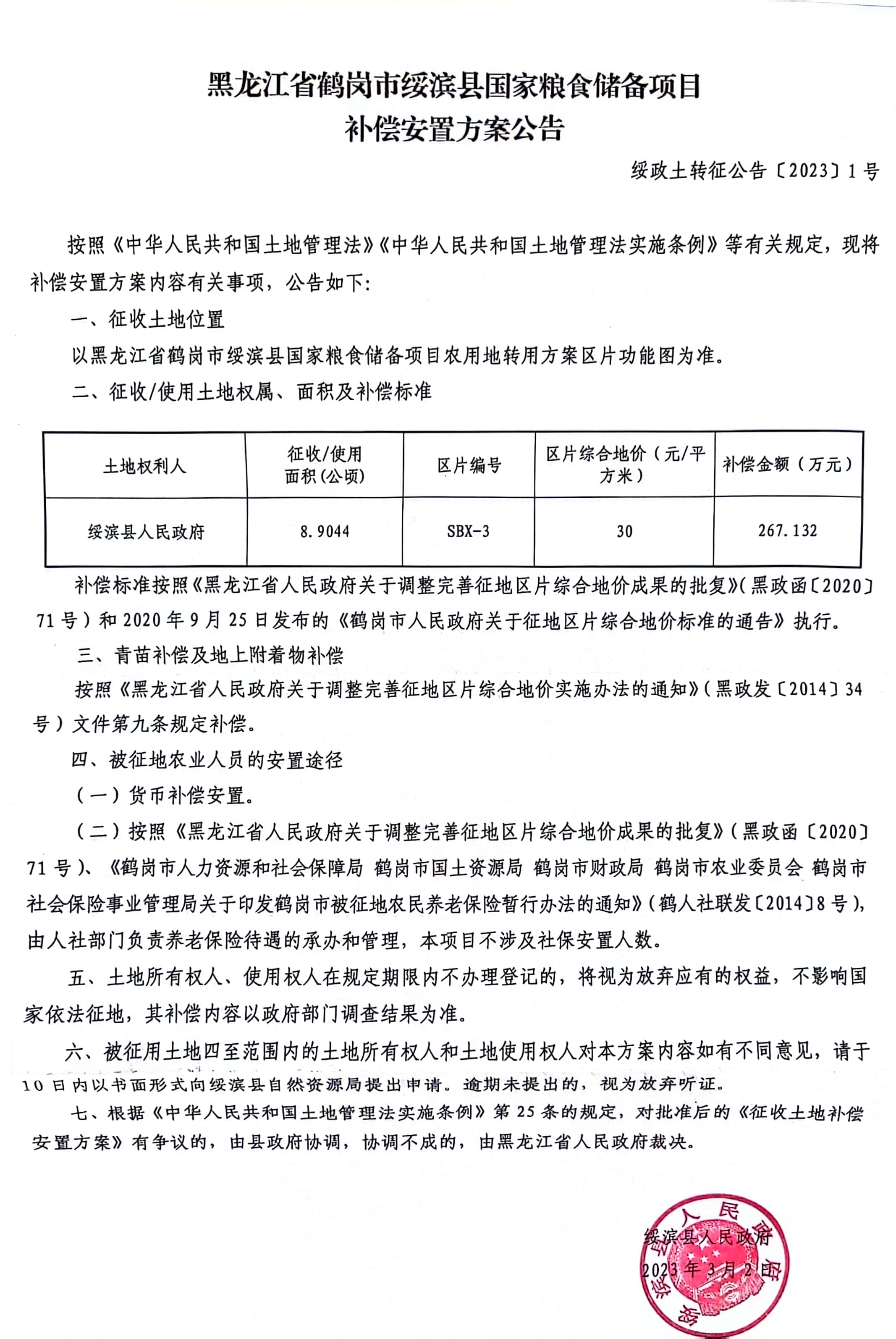 绥滨县国家粮食储备项目补偿安置方案公告 绥政土转征公告[2023]1号