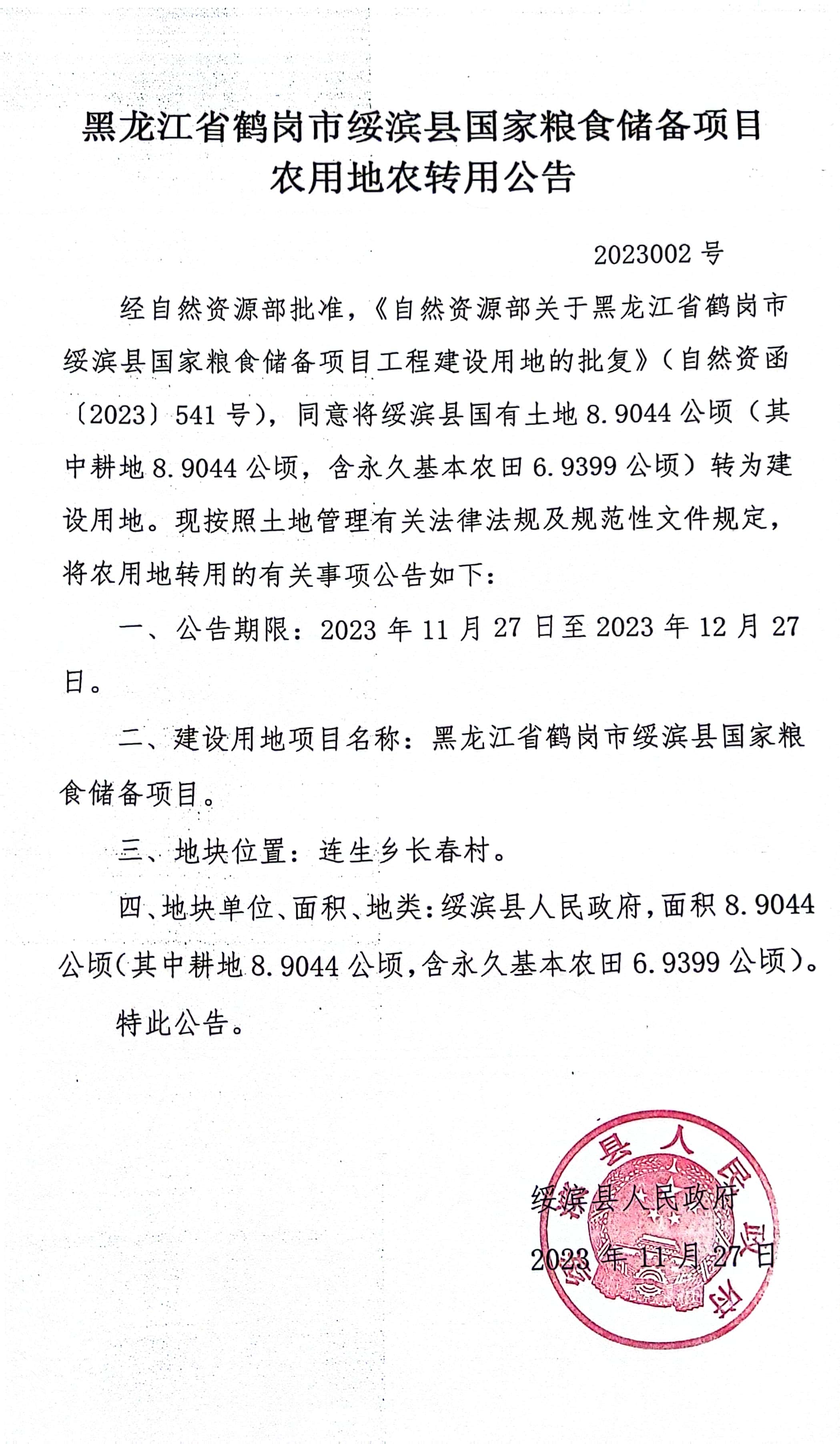 绥滨县国家粮食储备项目农用地农转用公告 2023002号