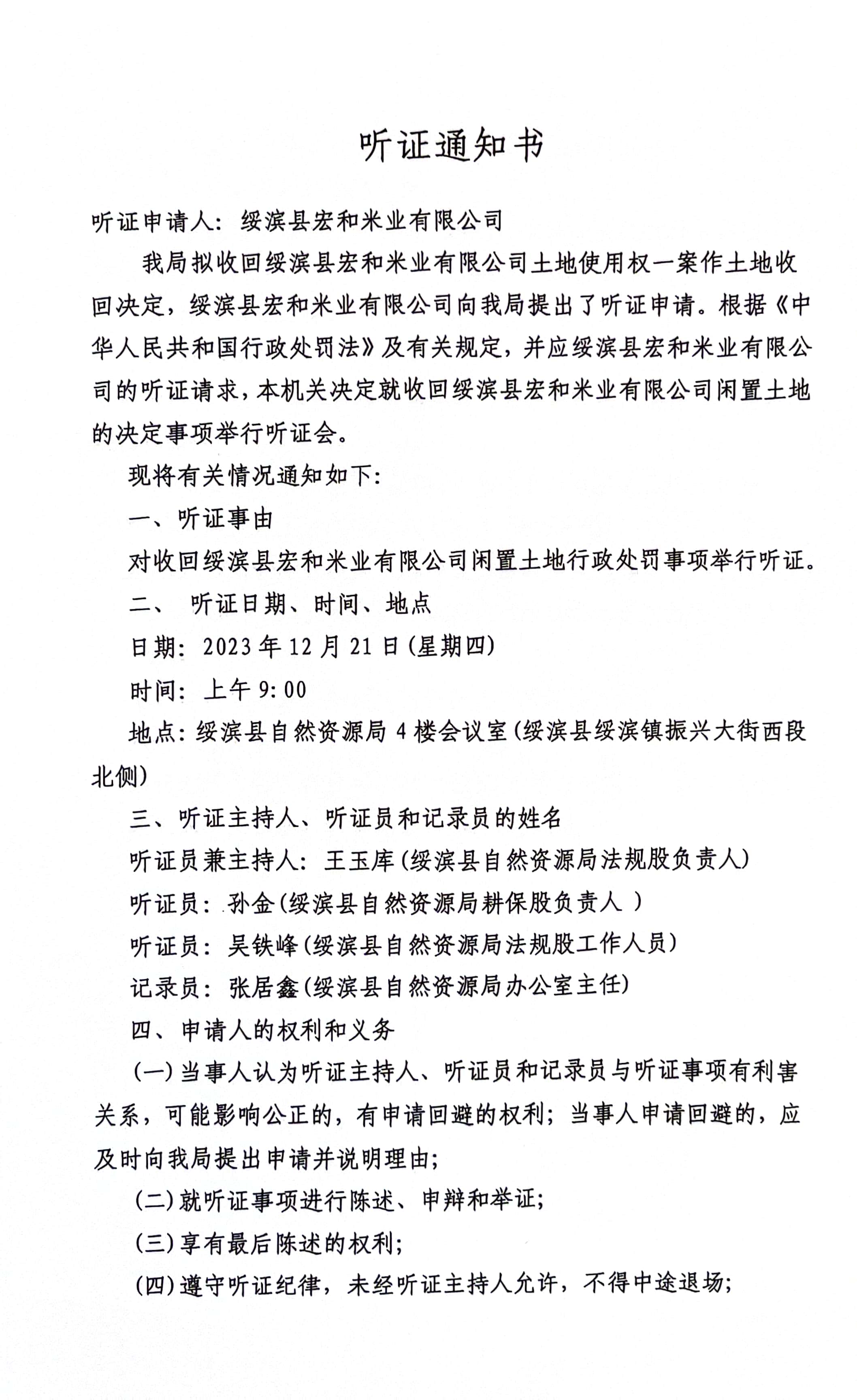 关于绥滨县宏和米业有限公司闲置土地的听证通知